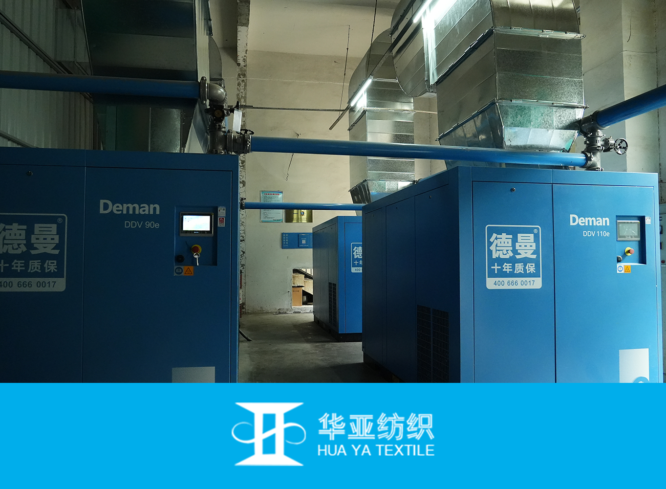 Fuzhou Changle Huaya Textile is one of China’s top ten polyester yarn brands. It covers over 300 acres, with more than 1,000 employees, and an annual output value exceeding 5 billion yuan. Deman upgraded the air compressor systems in their No.1 and No.3 spinning workshops. It’s been running stably for over a year since the upgrade with an annual electricity savings ≈ 350,000 kWh