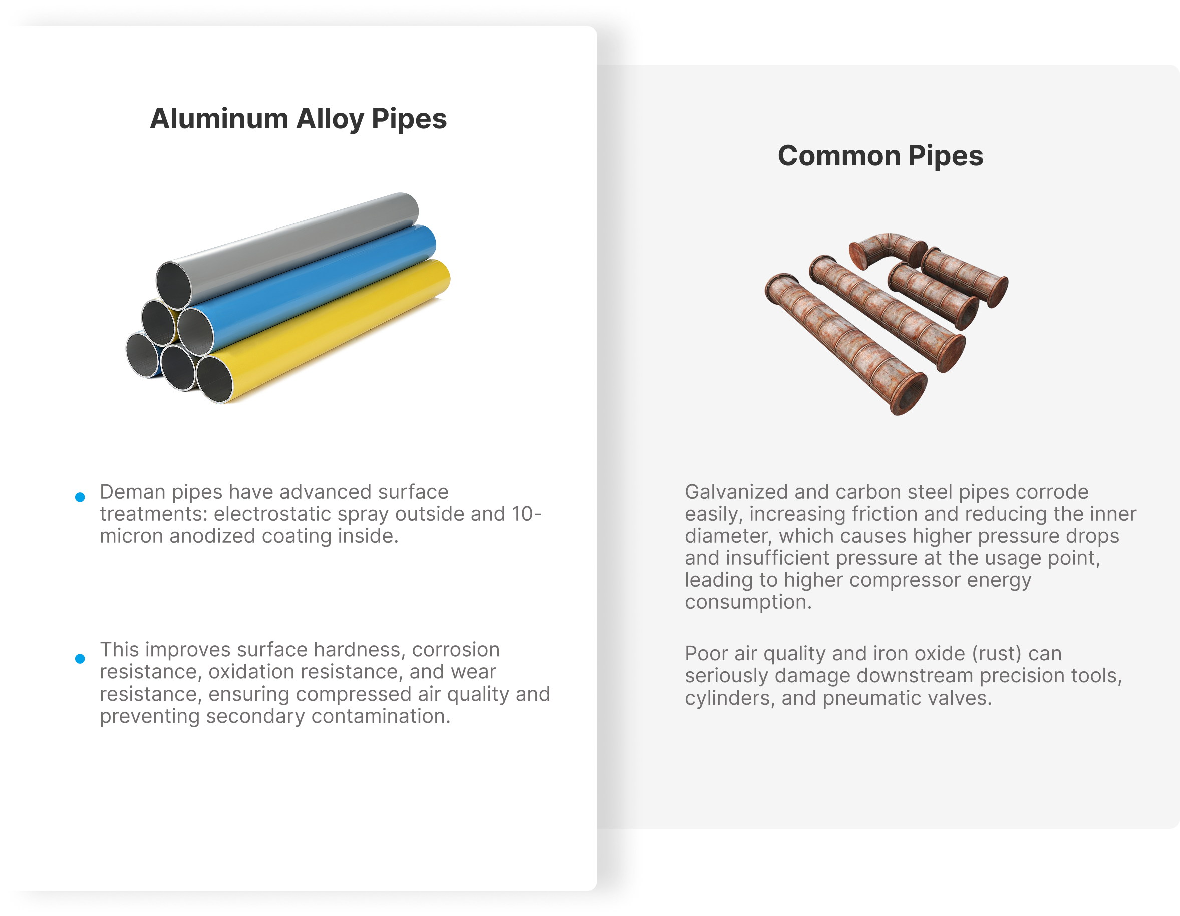 Widely used for conveying compressed air, vacuum, nitrogen, and inert gases, the system is a full replacement for all traditional carbon steel pipelines. All pipe specifications are manufactured with outer diameters strictly following national standards, ensuring seamless connection with standard fittings. Made from 6063-T5 aluminum rods and formed by extrusion using alloy molds, the pipes feature an internal smooth finish and a corrosion-resistant epoxy-coated exterior — delivering clean fluid transport at a lower cost.