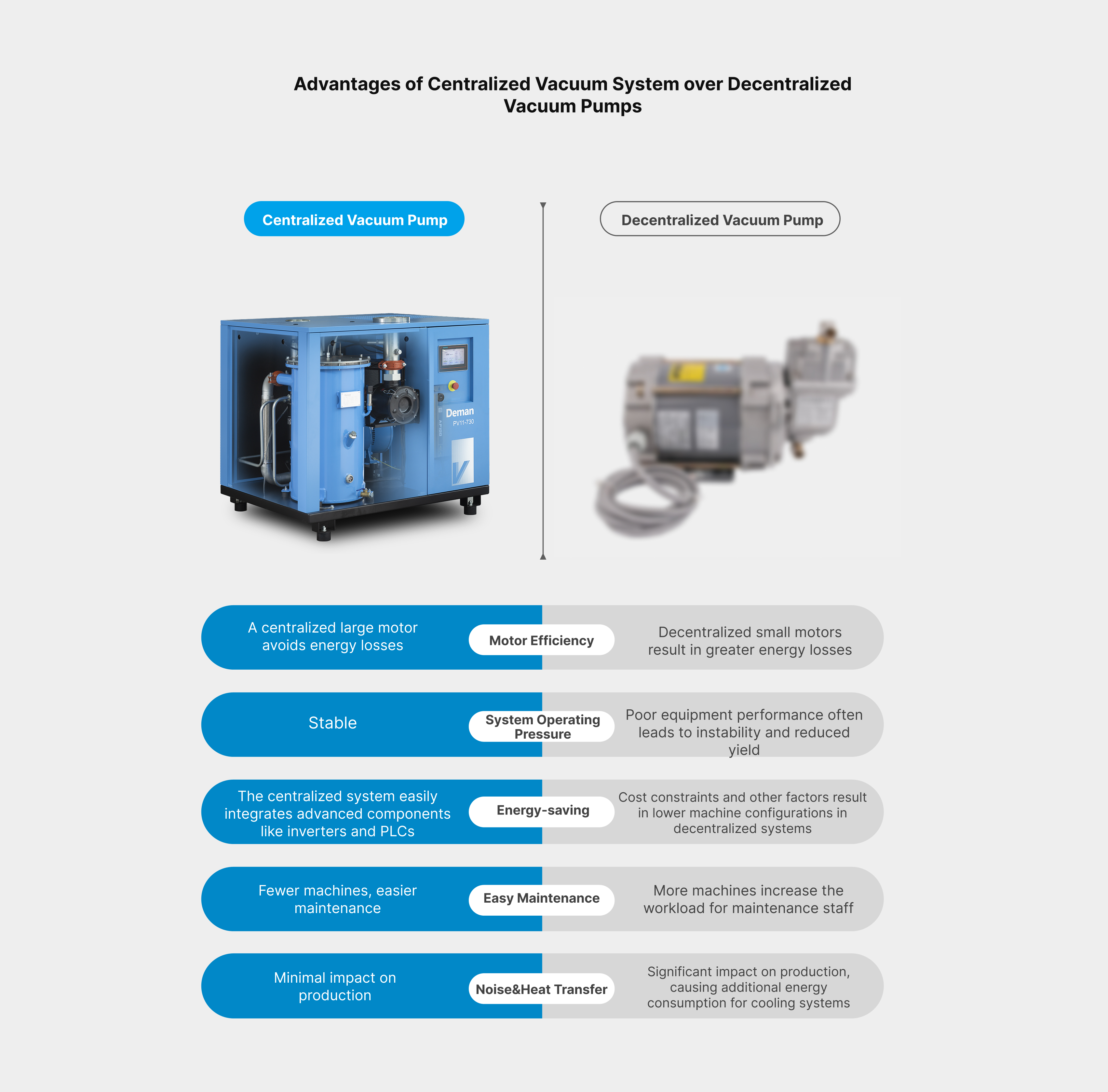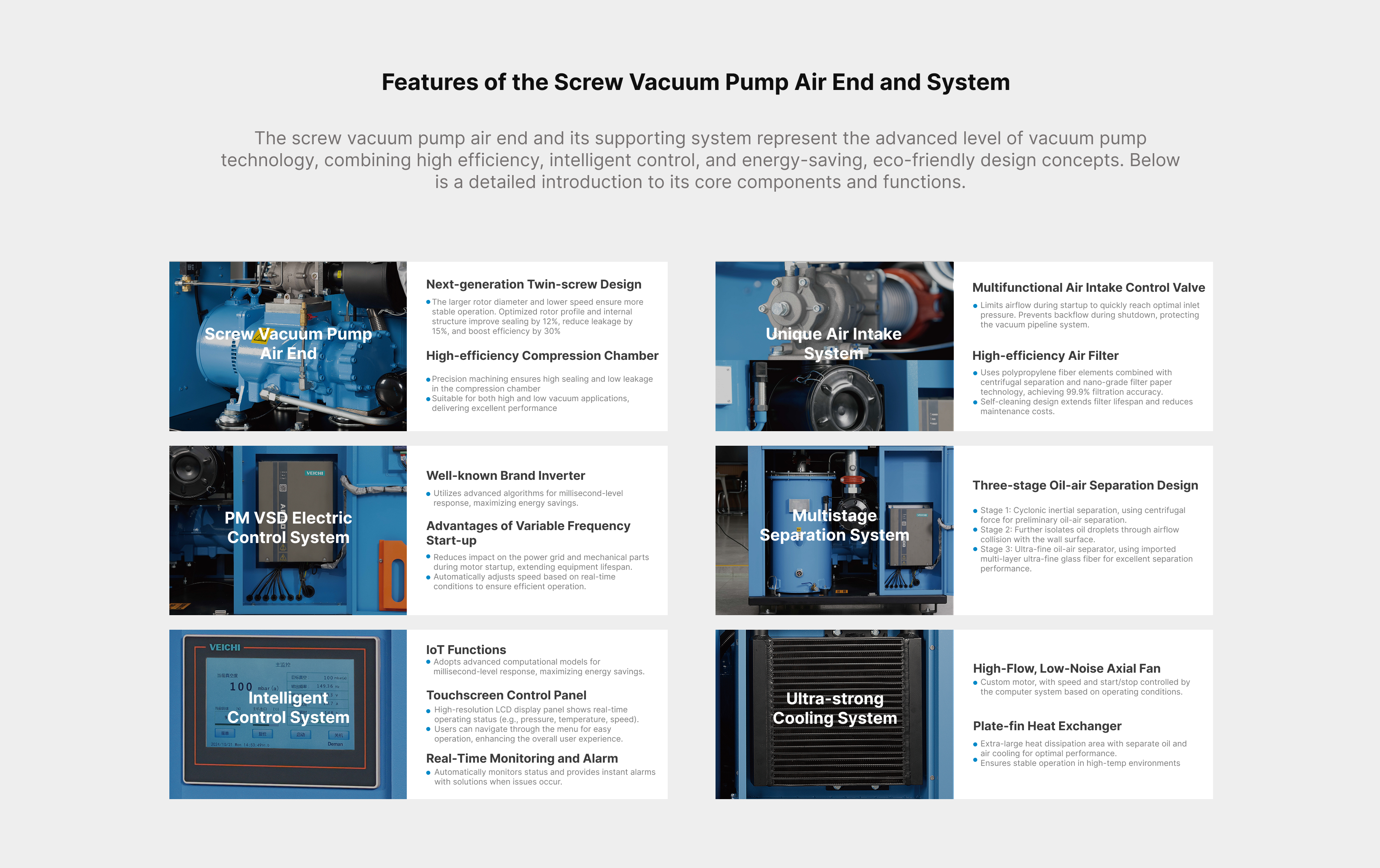 Oil-injected Screw Vacuum Pump (also known as Oil-lubricated Screw Vacuum Pump) is a highly efficient and stable vacuum solution that combines the advantages of screw pump technology with an oil lubrication system. Its working principle involves injecting lubricating oil between the screw rotors, where the oil acts as a sealing medium, provides lubrication, and aids in cooling — significantly enhancing the pump’s efficiency and operational stability.